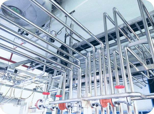 Piping systems are used to supply liquids, such as drinking water and chemicals, hygienically in production processes for food, beverage, and pharmaceuticals. Leveraging our expertise in piping technology for semiconductor plants, we offer solutions tailored to customer requirements in the pharmaceutical, food, and beverage industries, where high-quality construction standards are essential.