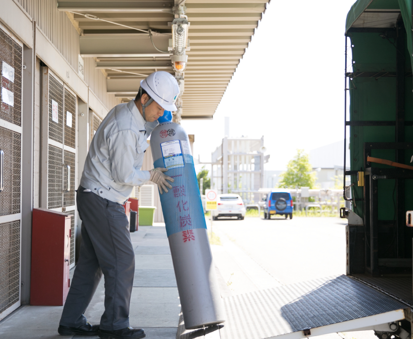 ボンベで供給する場合、私たちがトラックでボンベを運び入れ、使用済みボンベとの交換作業や供給設備のメンテナンスを行います。